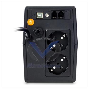 Phase MonophaséTechnologie Interactif en ligne (VI)Typologie TourForme d'onde de sortie Onde sinusoïdale simuléeFacteur de puissance de sortie 0,6Puissance 800 VA / 480 WTension nominale d'entrée 230 VPlage de tension d'entrée 170-280 VCAFréquence nominale d'entrée 60/50 Hz (détection automatique)Tension nominale de sortie 230 VCAPrécision de la tension de sortie ± 10 %Prises 2 x Schuko avec batterie de secours2 x RJ11 (entrée/sortie) pour la protection contre les surtensions modem/téléphonePrésence de piles 1 x internePile installée 1 x GP09122LÉcran LCD Oui (écran tactile)Autonomie typique 4 minutes à 50 % de charge (240 W)Ports de communication USBNiveau sonore < 40 dBCaractéristiques Écran LCD tactile pour l'affichage circulaire des informations de l'onduleurBoost et Régulateur de tension abaisseur pour la stabilisation de la tensionRedémarrage automatique pendant la récupération du courant alternatifCharge en mode arrêt