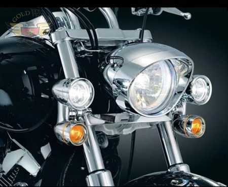 These streamlined Constellation Driving Lights withTurn Signals really shine with their cutting-edge design. No ancient bulky spot-lamps with large supporting cross bar here, these super bright beauties fit right inplace. With H3 bulbs in a 3" diameter stretched bullet housing that flows down to a coordinating 2-1/4" turn signal housing, these are the answer to your stylin' frontlighting. Designed to mount directly to your forks withKüryakyn Two-Piece Clamps. Fits: Universal applications for installation with Küryakyn Two-Piece Clamps. (Not intended for use on motorcycles with OEM fork shrouds)